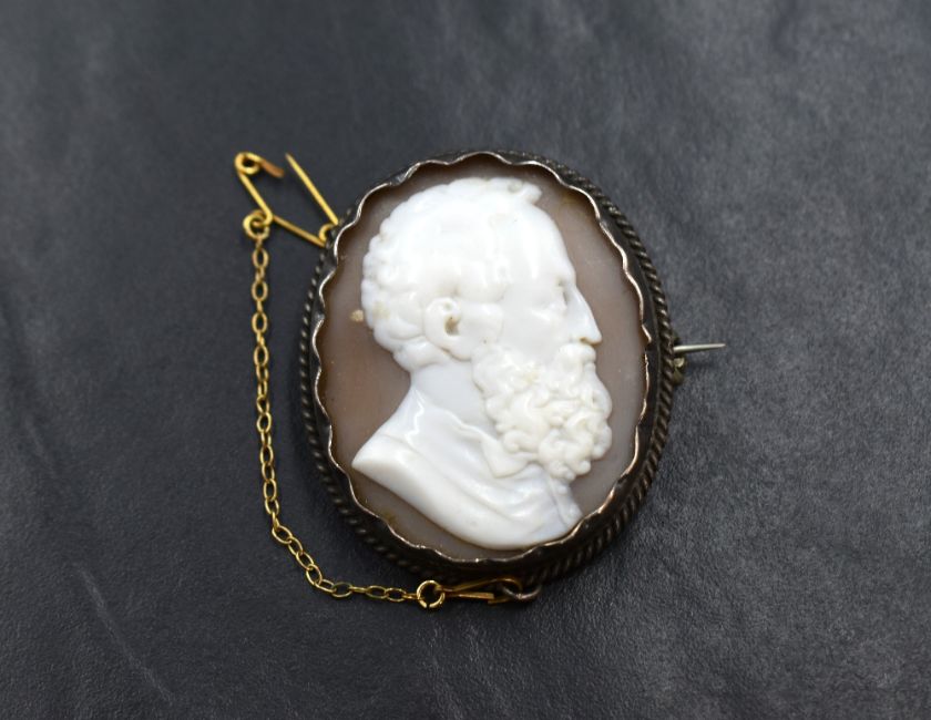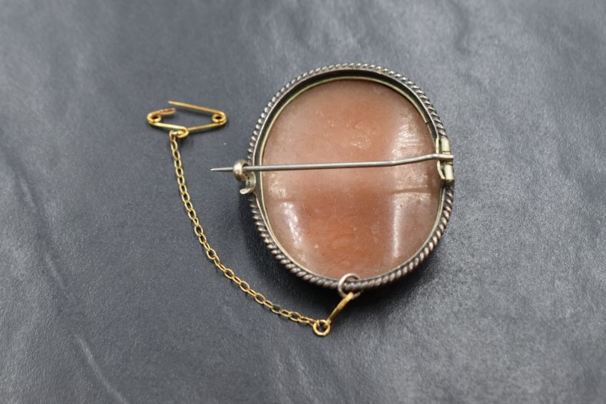 A conch shell cameo brooch depicting a gentleman in profile in a collared white metal mount, no marks