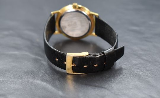 A Royce 17 Jewel Incabloc wristwatch, having a champagne dial with baton numerals and subsidiary dial, on a leather strap in a Royce box