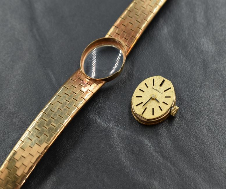 A vintage 9ct gold Caravelle wristwatch, the oval golden dial having baton numerals, on a 9ct gold bracelet strap, 22.7g