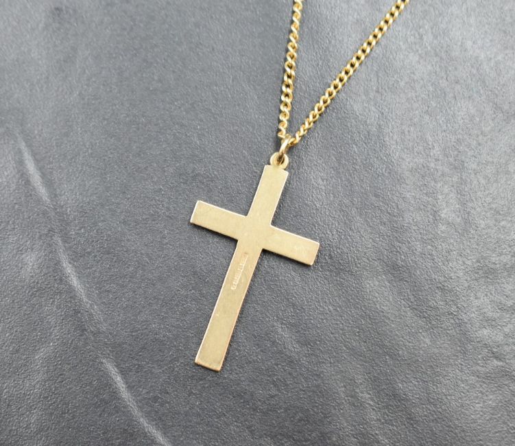 A 9ct gold cross having engraved scroll decoration on a yellow metal chain bearing mark SPAIN18, 24' & 8.5g total (7g & 1.5g)
