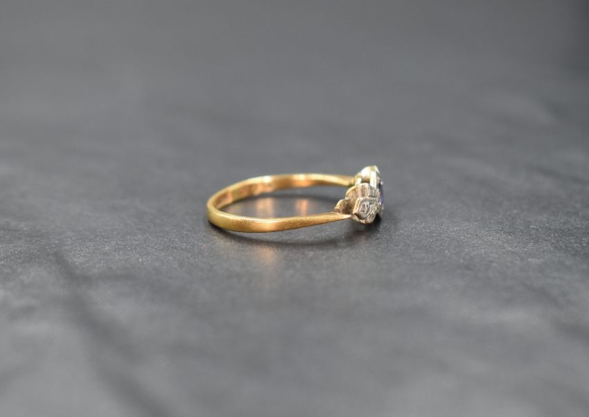 An Edwardian yellow metal sapphire and diamond chip ring stamped 18ct having a central powder blue sapphire in a platinum bow style mount set with two diamond chips, one missing and loop split, size N & approx 2.3g
