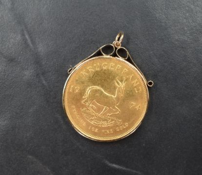 A Krugerrand 1974 coin, within a 9ct gold mount, 36.2g