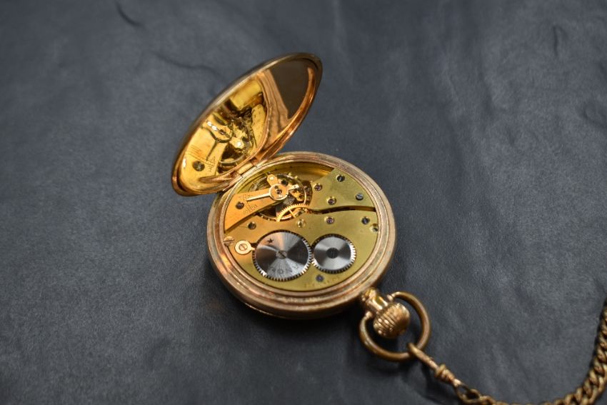 A gold plated Full Hunter top wound pocket watch marked The Angus to mechanism and face, having Arabic numeral dial with subsidiary seconds in a plain case bearing monogram to front cover, with a rolled gold double Albert watch chain, missing a clasp, approx 139.7g gross