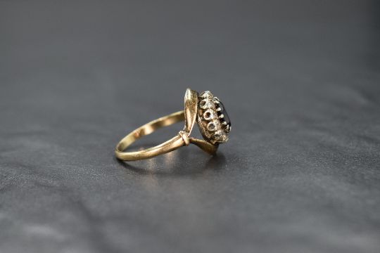 A garnet and clear paste cluster ring having a claw set mount with split shoulders on a 9ct rose gold loop, size Q & approx 3g