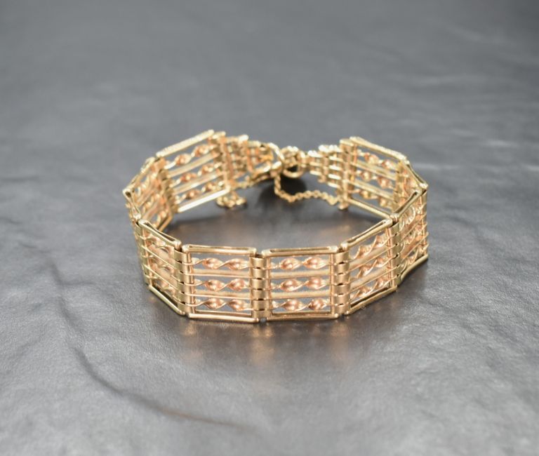 A 9ct gold seven bar gate bracelet having twist bar decoration and a padlock clasp, approx 185mm & 19g