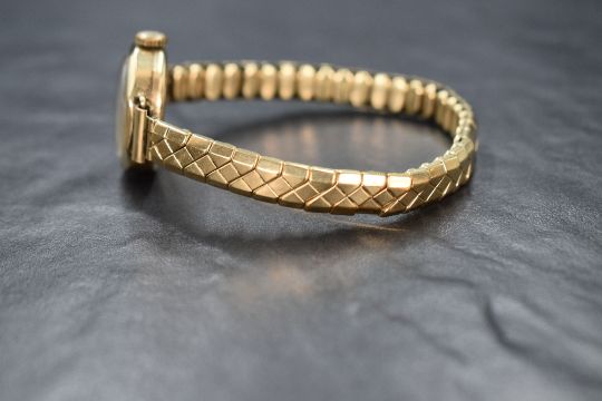 A lady's vintage 9ct gold wrist watch by Avia having Arabic numeral dial and subsidiary seconds to circular face (discoloured) in a shaped 9ct gold case on a rolled gold stretch strap