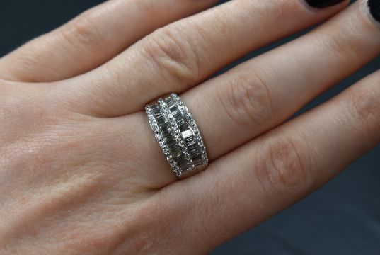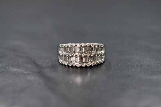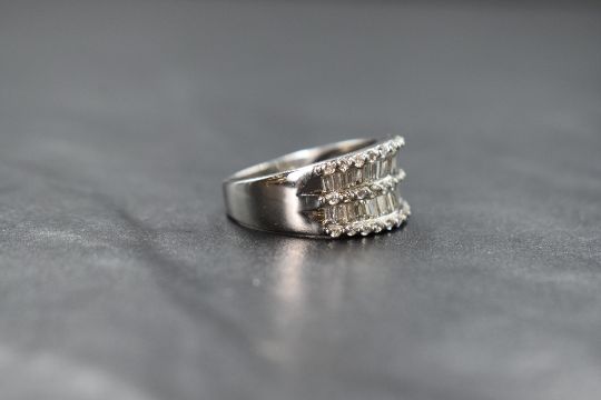 An 18ct white gold diamond five row shaped band ring having two rows of baguette cut diamonds interspersed and bordered by rows of diamond chips, size O & approx 5.1g