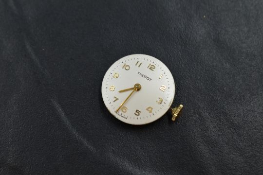 A lady's 9ct gold wrist watch by Tissot having Arabic numeral dial to champagne face in a plain gold case on a tan leather strap, ticks when wound but we do not test for functionality