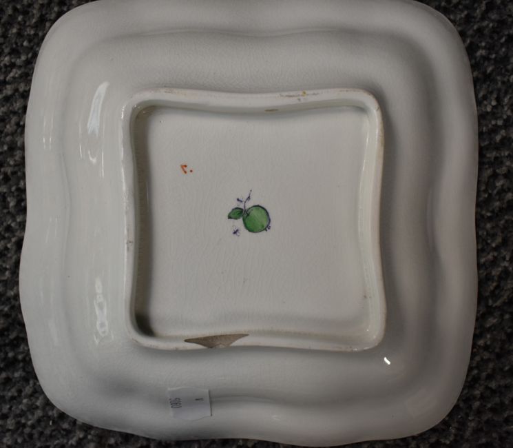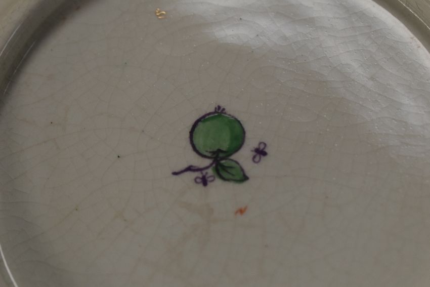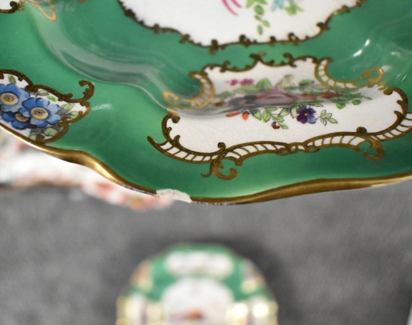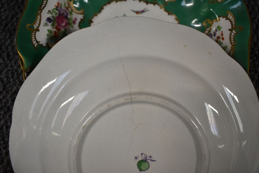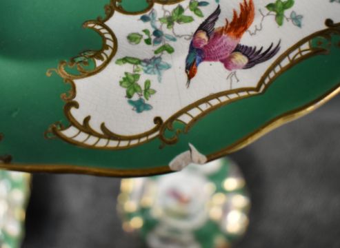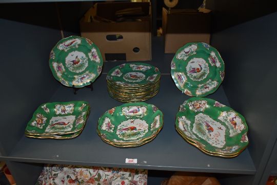 A 19th century earthern ware desert service in the manner of Chelsea or Worcester, decorated with pheasants, foliage and gilt edging on a green ground, approx 18 pieces. Condition: damage to one plate and dish.