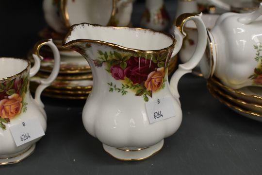 A Royal Albert bone china tea service, decorated in the old country rose pattern, to include small lobed form cups and saucers, tea pot, coffee pot, cream jug, napkin rings ect, approx. 56 pieces. Condition: Presented in very good condition.