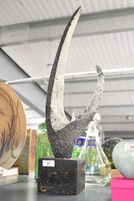 A large abstract patinated metal claw shaped sculpture, supported on a wooden block base, h57cm.
