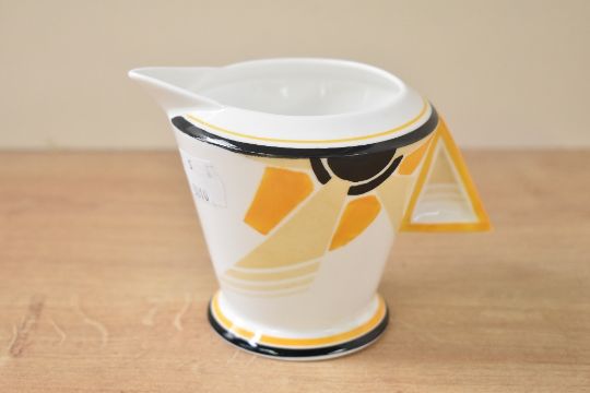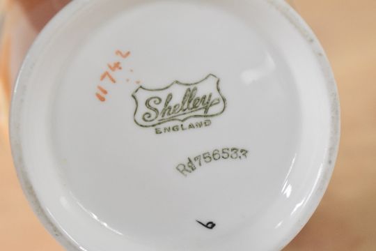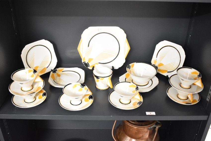 A decorative Shelley Porcelain Vogue Sun Ray Art Deco pattern tea set, factory mark to base, approx. 21 pieces. Condition report: hairlin crack to one cup.