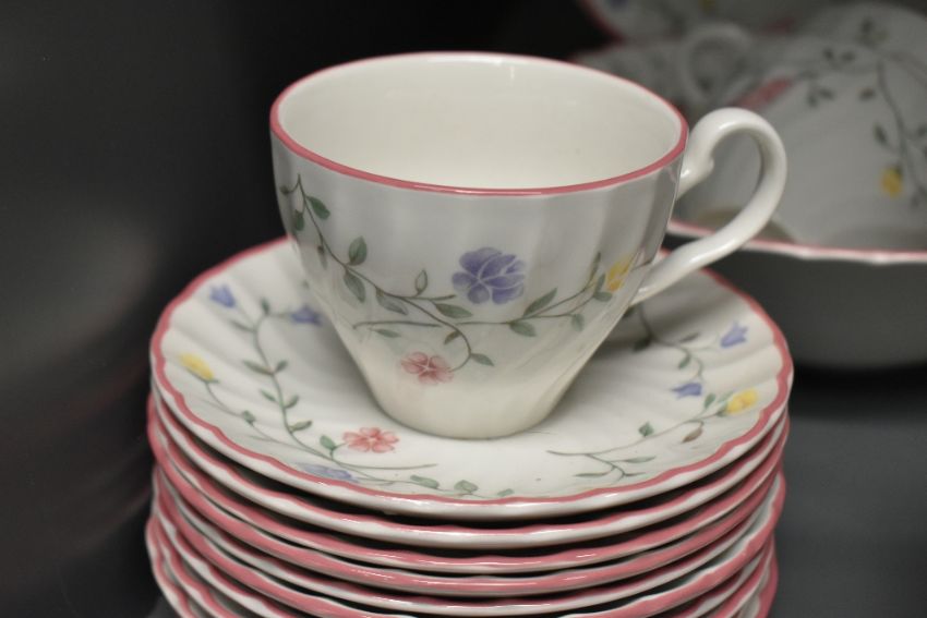 A Johnson Brothers fine bone china tea service, decorated with foliage and pink edging on a white ground, approx. 60 pieces. Condition: damage to one bowl.