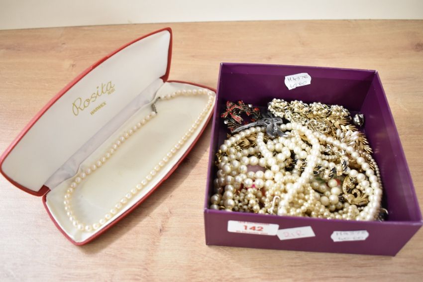 A collection of costume jewellery, including a boxed string of cream cultured pearls with a silver clasp, imitation pearls and brooches, etc