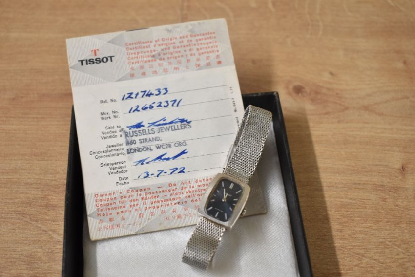 A vintage Tissot wristwatch, the rectangular dial having baton numerals on a stainless steel mesh bracelet strap, with Tissot Certificate of Origin
