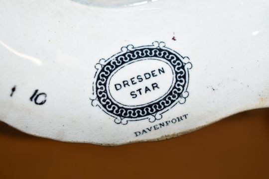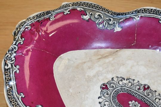A group of early 19th century Davenport dishes in the Dresden Star pattern, decorated with baroque style scrolling on a burgundy and white ground, approx, 6 pieces. Condition: Excessive chipping and old repairs.