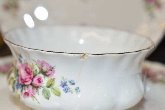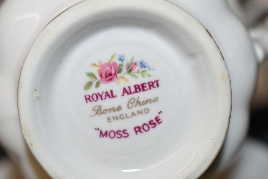 A Royal Albert fine bone china tea service, decorated with gilt edging and foliage on an ice white ground, approx. 34 pieces Condition: Damage to one cup and sugar bowl.