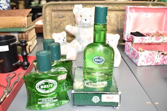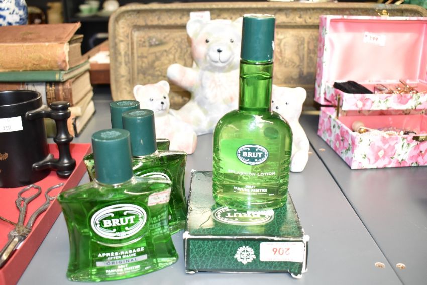 Four men's Brut aftershave, one in original box, 12cm, sold alongside a plastic bottle of splash-on lotion, h16cm.