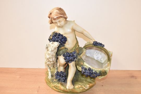 A Capodimonte style figure depicting a young boy with basket having blue berry decoration, unmarked.