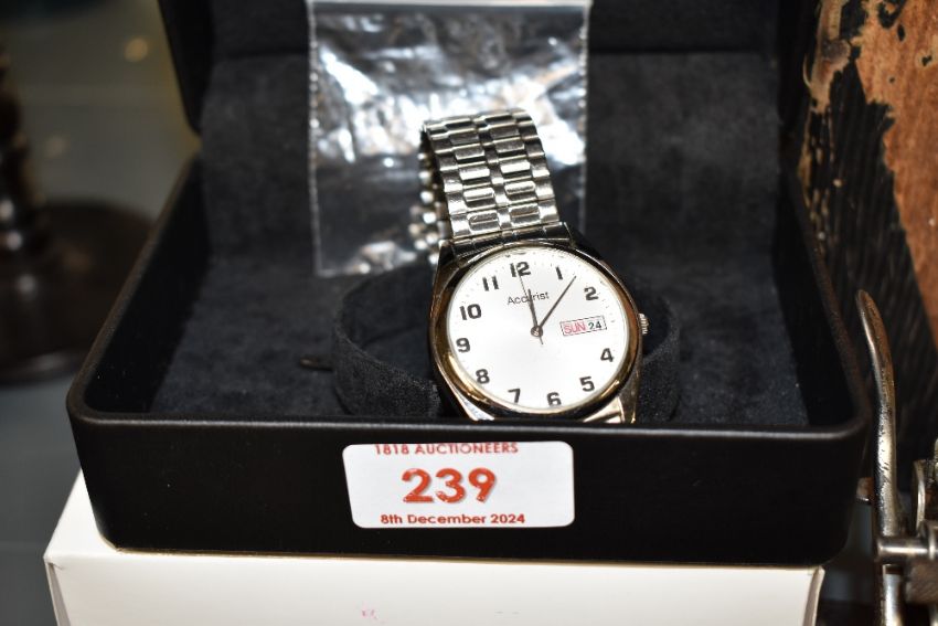 A stainless steel Accurist wristwatch, the white dial having Arabic numerals with day and date aperture, on an extending bracelet strap, in original box with extra strap links