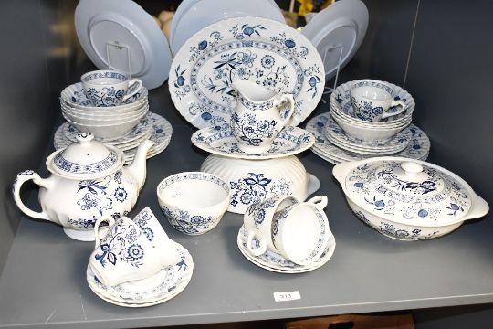 A J & G Meakin tea service in Blue Nordic pattern, decorated with blue foliage on a white ground, to include tea pot, sugar bowl, cream jug ect, approx. 34 pieces Condition: Veg Terrine missing lid. Two saucers missing.