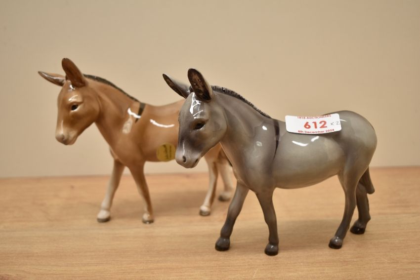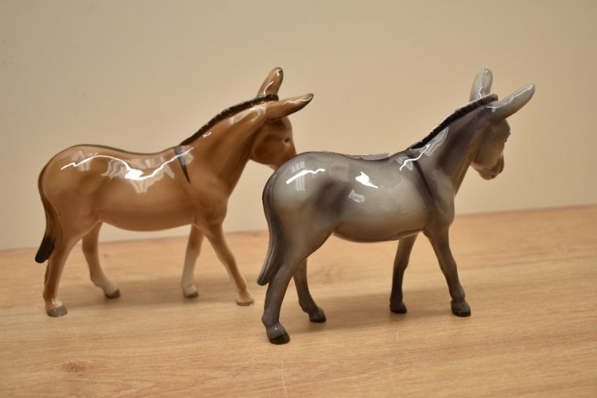 A pair of John Beswick pottery donkey's, in brown and grey gloss finish, both signed to the underneath. Complete with boxes.