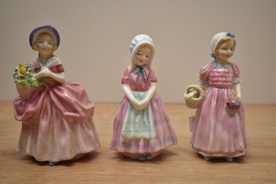 A group of five Royal Doulton figurines comprising 'Tinkle Bell' HN 1677, 'Cissie' HN 1809, 'Tootles' HN 1680, 'Goody Two Shoes' HN 2037, 'Linda' HN 2106 all sold together with an Arcadian China 'June' figure stamped 73 to underside.