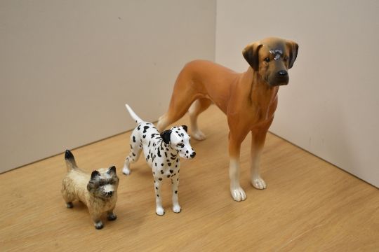 A Royal Doulton bone china Dalmatian HN1114 sold together with a Beswick Pottery study of a Cairn Terrier number 2112 in dark cream gloss designed by Arthur Gredington & Albert Hallam and a porcelain study of a great dane.