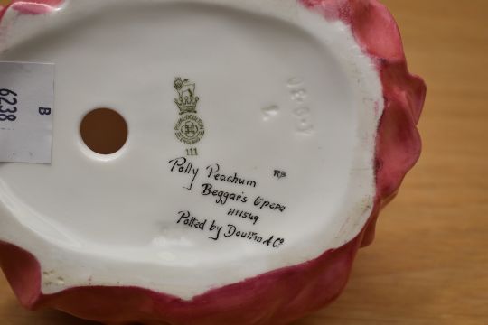 An early Royal Doulton figurine 'Polly Peachum' HN 549 sold together with two Lladro porcelain animal studies 'Resting Polar Bear' number 1208 and 'Little Duck' number 4553.