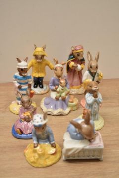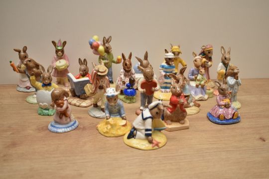 Twenty Two Royal Doulton bone china Bunnykins Series figures including characters 'Seaside Bunnykins' DB 177, 'Mother Bunnykins' DB 189, 'Congratulations Bunnykins' DB 291 from the Occasions Collection and Dollie Bunnykins 'Playtime' DB 88 etc.