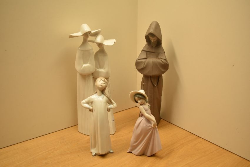 A group of four Lladro porcelain figures comprising 'Two Sisters in White' number 4611, 'Monk' number 2060 in matt finish, 'Girl Stretching' number 4872 and 'Iris' number 6276.