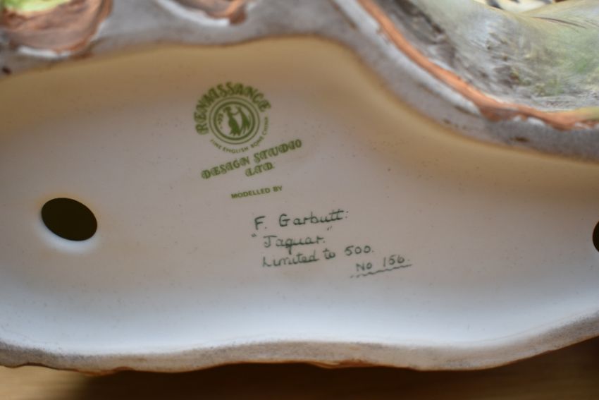 A Renaissance fine English bone china limited edition study of a Jaguar mounted on wooden log. Designed by Howard J. Wedgwood, modelled by F. Garbutt, number 156/500. Crack to backside as photographed.
