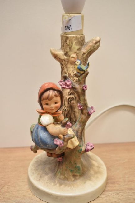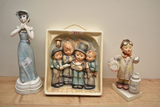 A Goebel porcelain figural table lamp number 229 sold together with 'Huldah Spring Lady' number 740, Quartet Wall Plaque number 134 and 'Little Pharmacist' number 322.