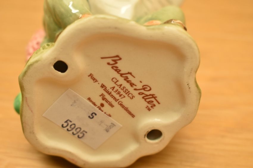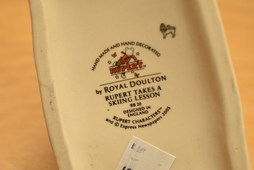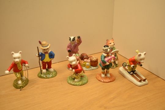 Five Royal Doulton Rupert Bear figurines comprising 'Rupert Takes A Skiing Lesson' RB 20, 'Rupert And The Little Sea Sprite' RB 22, 'Bingo's Huge Firework' RB 10, 'Finshing Arrows And Stringing His Bow' RB 7 (AF), 'Looking Like Robin Hood' RB 6 all sold together with The Wind in The Willows 'Badger's Winter Store' WW8 and Beatrix Potter's Classics AB A3947.