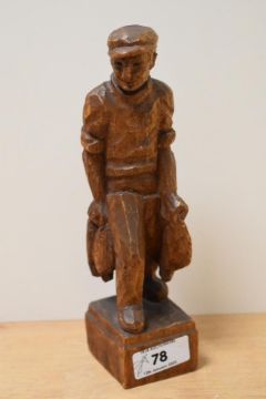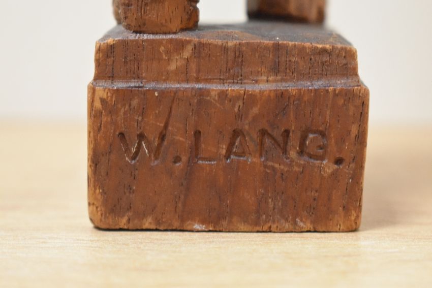 A 20th Century carved oak folk art study of a fisherman and his catch, signed 'W.Lang' to the rear and measuring 21cm high