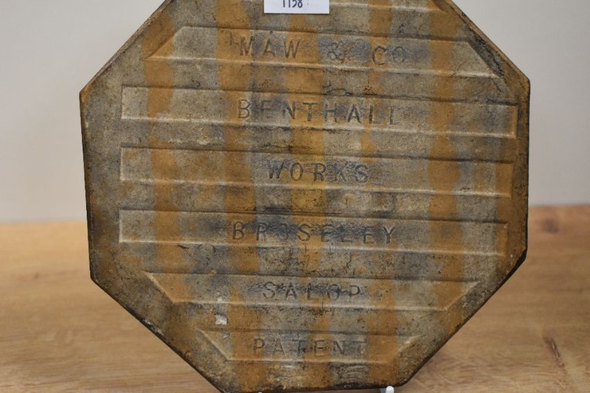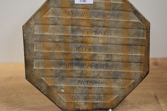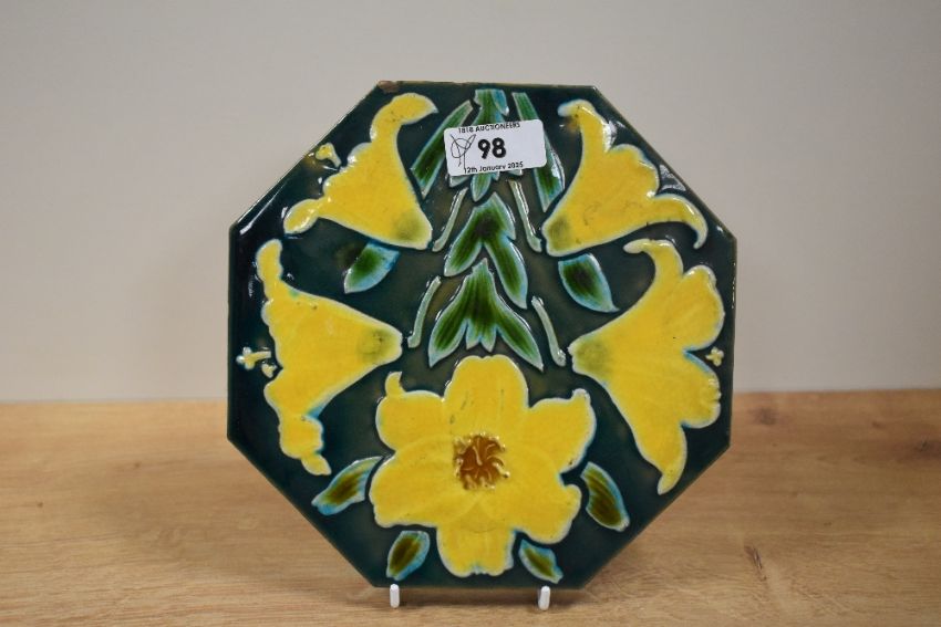 A late 19th Century octagonal shaped tile by Maw & Co., Benthall, the glazed design depicting yellow daffodils against a green ground, measuring 18cm wide