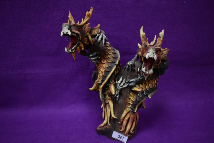 A striking hand-carved and painted wood double dragon head sculpture 30cm