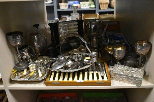 A group comprising of silver plate cutlery, goblets, tea pots, jewellery box, candle holders ect
