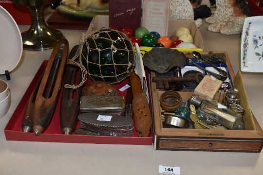 Three boxes containing books, trinkets, weaving looms, fruit knives, letter openers, stamps ect.