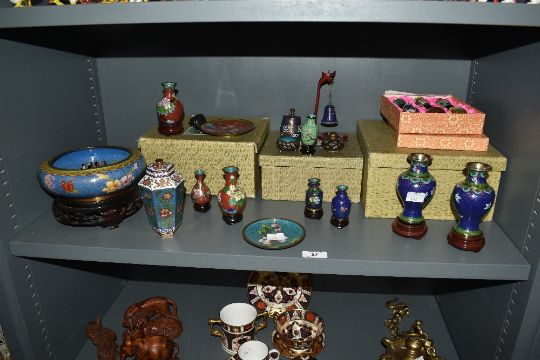 A selection of Cloisonne enamel baluster vases, decorated with multicoloured flower motifs, gilt edging and brass wire work, some on wooden display stands, to include a box of six miniature vases, a Cloisonne dish, w17cm ect, approx. 22 pieces.