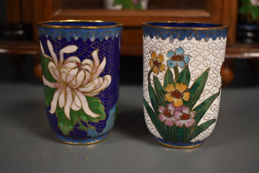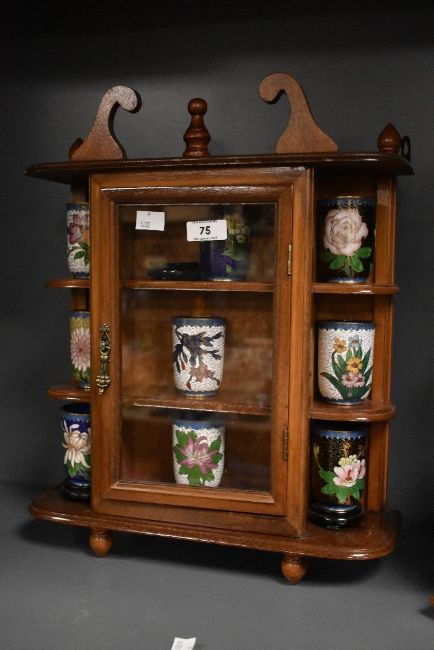 A vintage table top glazed display cabinet holding a selection of Cloisonne oriental cups, decorated having enamel multicoloured flower motifs with brass wire work, h7cm, (9)