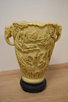 A large reproduction simulated ivory vase, of Chinese design and moulded in relief, with elephant mask 31cm