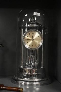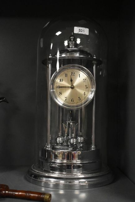 A large chrome plated 400 day anniversary clock, under glass dome with torsion pendulum 43cm