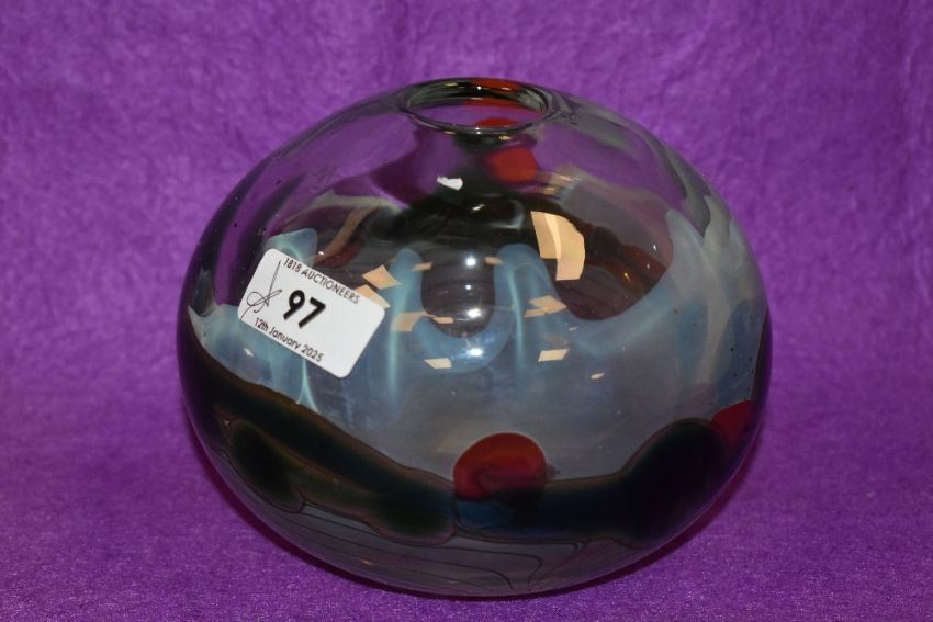 A John Ditchfield clear art glass vase, of spherical form with a trailed design featuring a band of varying colour, signed and marked 1981 to the underside, measuring 12cm high