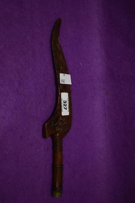 A 19th century carved knitting stick, of traditional 'wing' form with carved and turned detail, initials J+S formed with pins to upper body, 28cm