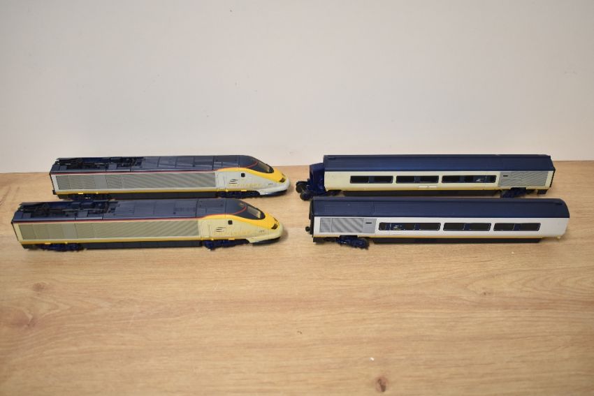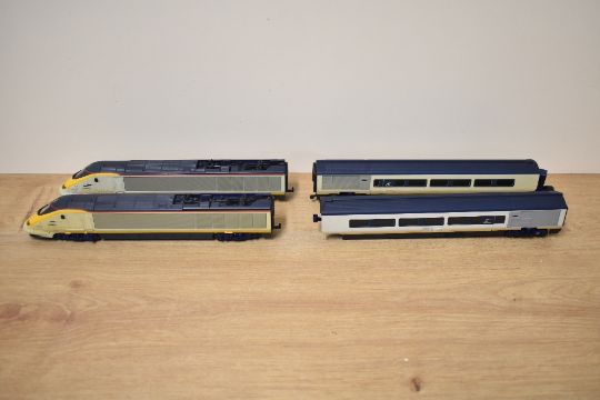 A Hornby 00 gauge Eurostar Class 373 Powered Locomotive, Unpowered Locomotive and two Passenger Saloons, in original box with internal packaging present, very little use
