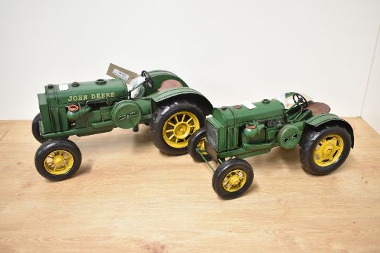 Two reproduction Lesser & Pavey Limited tin plate John Deere Model Tractors, both exhaust pipes present but unattached
