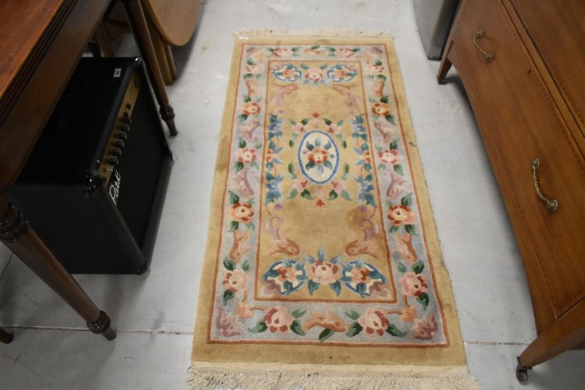 A modern Chinese fireside rug, having ochre ground, approx. 150 x 70cm