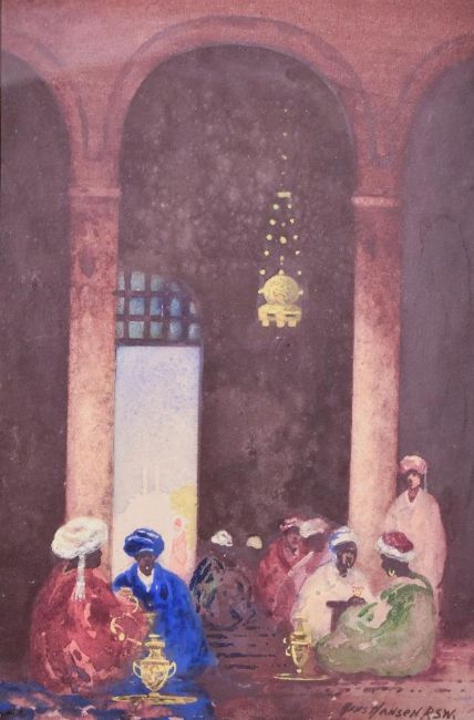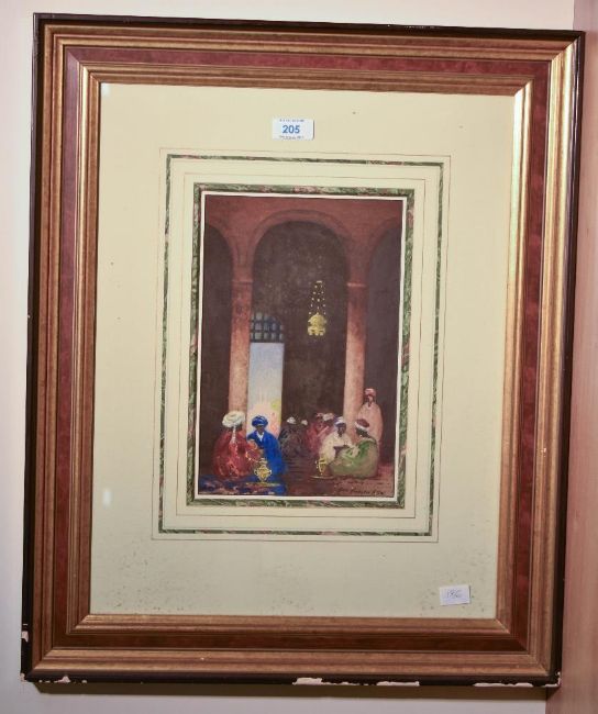 Hans Hansen RSW (1853-1947, British), gouache, An Arabian interior scene with seated figures, signed to the lower right, framed, mounted, and under glass, measuring 17cm x 25cm, & 47cm x 57cm overall