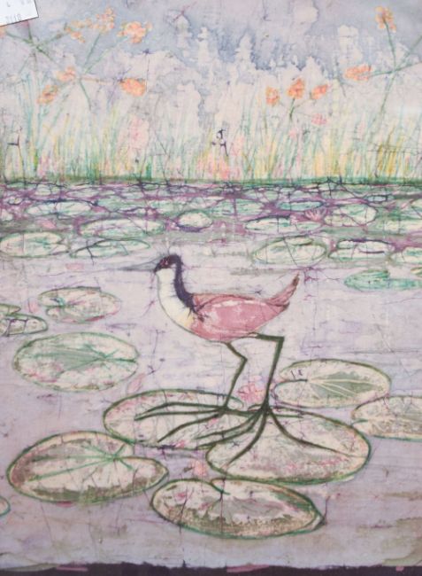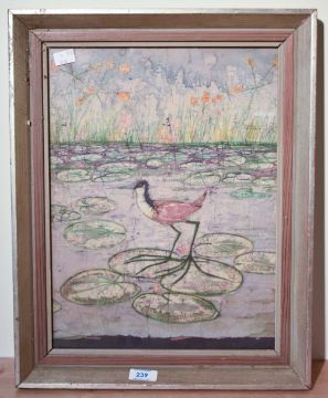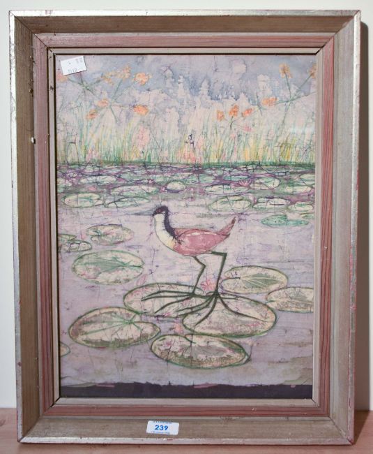 An unusual painting on material, an African Jacana standing on lily pads, within a moulded fame, under glass 39cm x 29cm & 47.5cm x 37.5cm overall.